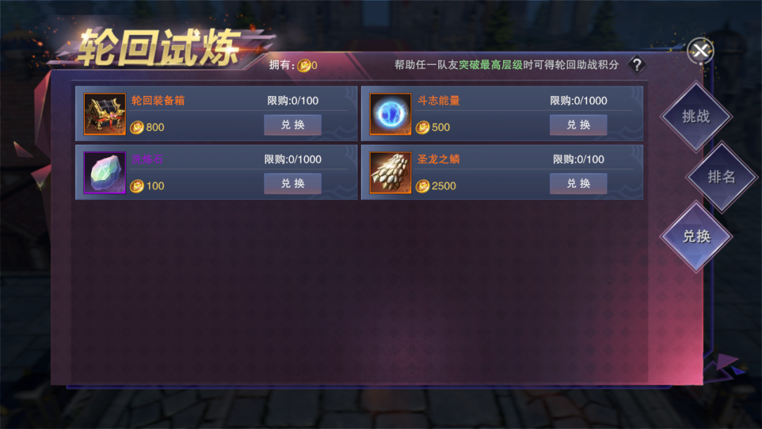 5.助战积分:在组队挑战时,若自己挑战已通过层级,且队伍中有任意一位玩家没有通关该层级,则可获得轮回助战积分。