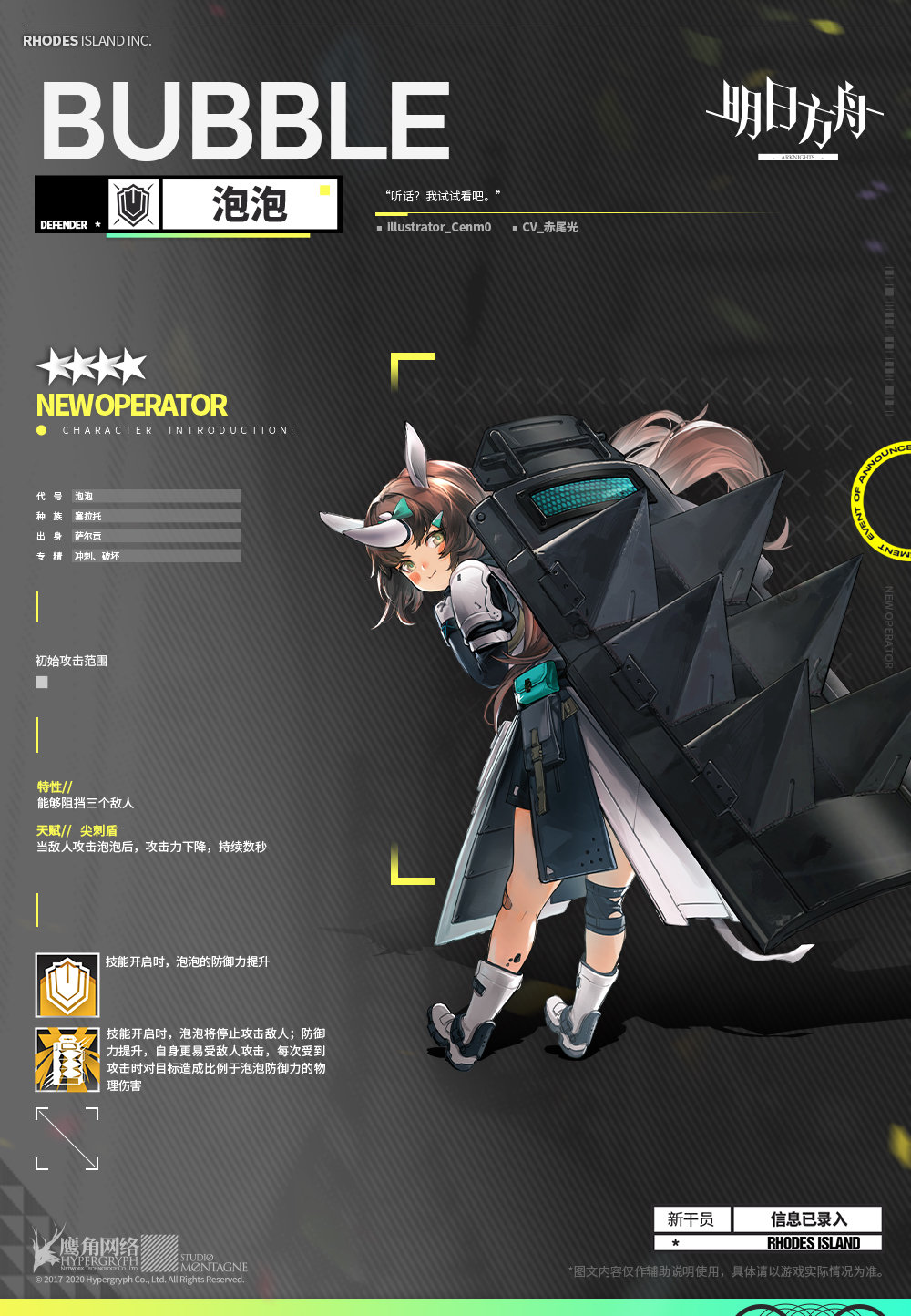 为了锻炼泡泡,她被带到罗德岛来接受训练,但实际上,她是来罗德岛治疗矿石病的,这一点,泡泡本人完全不知情。