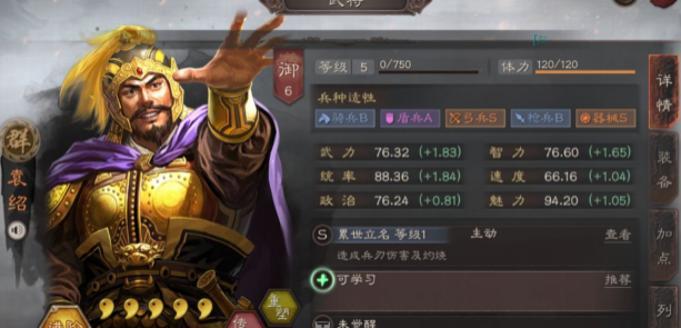 武力成长1.83、智力成长1.65、统帅成长1.84。