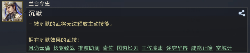 当然,除了主将技之外,有些武将同样可以在副将位,打出ldquo;沉默效果。比如诸葛亮兑换的武技ldquo;空城计可以在生效后,对敌方施加足足20秒的ldquo;沉默效果。又比如郭嘉的独特武技ldquo;奇佐,可以在郭嘉每次释放主动技能时,在一定概率下随机对敌方造成ldquo;沉默效果。