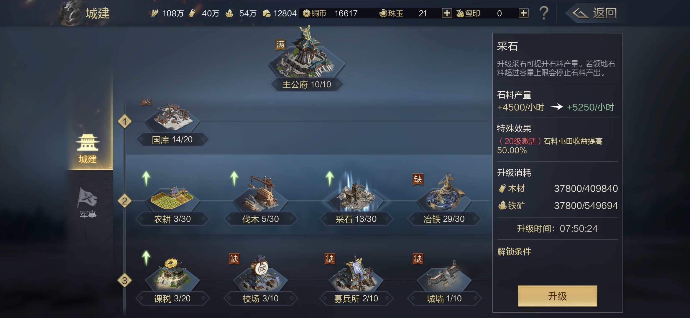前期就做名望任务,跟着任务走即可,除了做任务的要求,伐木、采石、冶铁、课税的优先度都比农耕高,这三类资源是我们升级城建科技的主要资源,消耗更为迅速。反而粮草是征兵时消耗大,种田玩家可暂时不急。