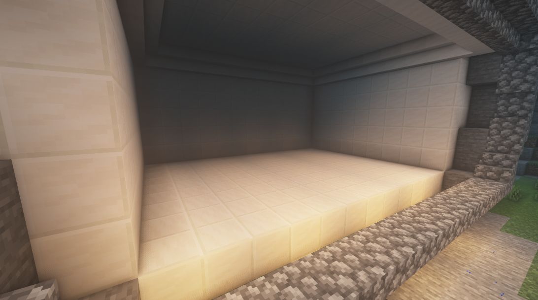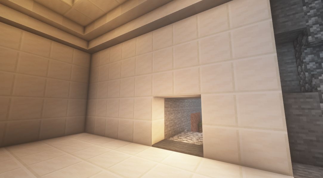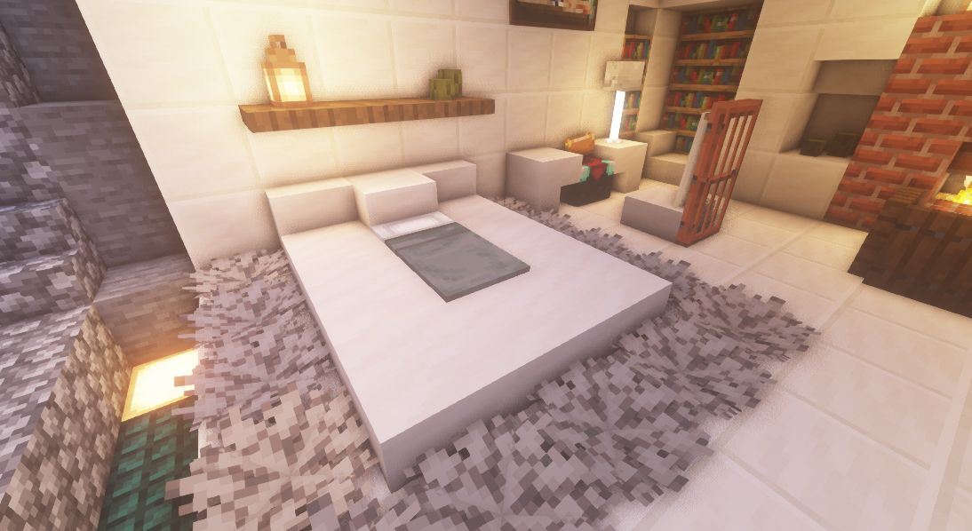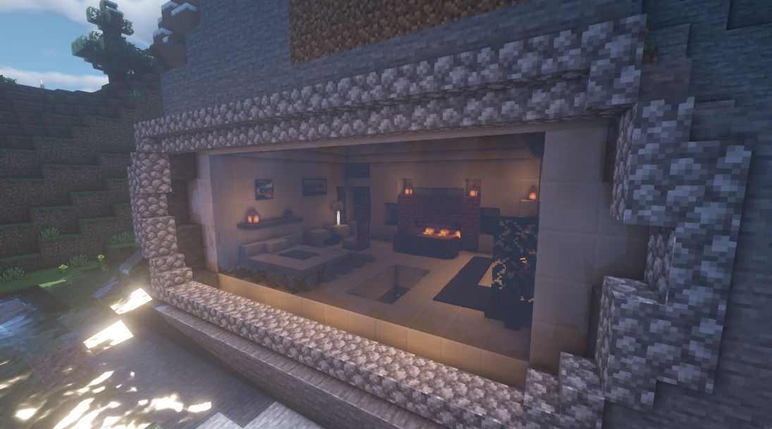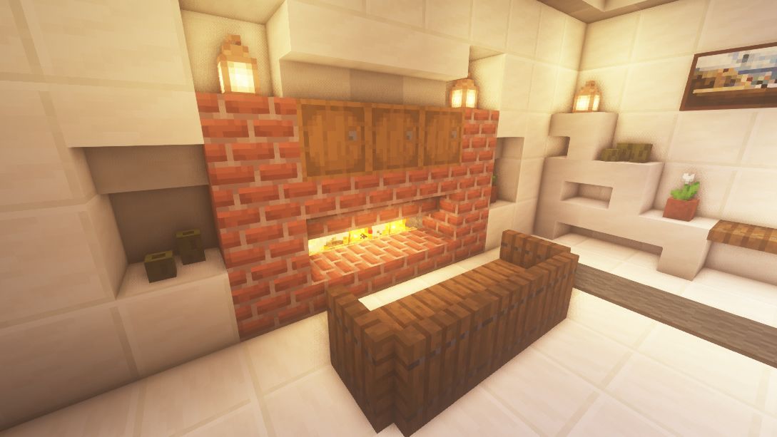 房子内部用砖块,砖楼梯和营火做了一个壁炉,上方可以放置木桶增加储物空间。