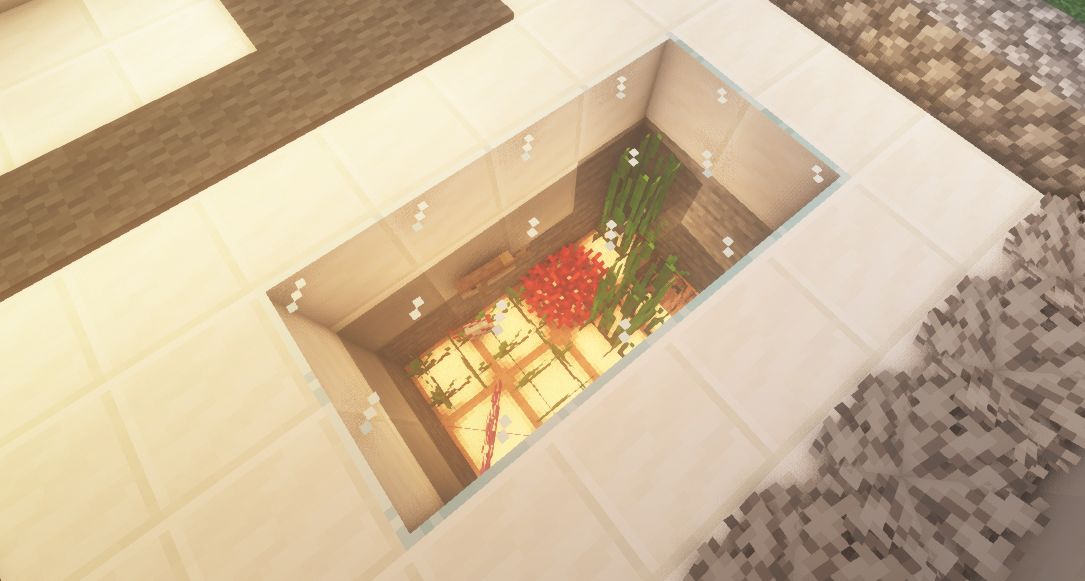 还挖了一个透明的地面水族箱,放入海晶灯,热带鱼跟珊瑚。