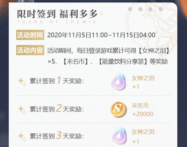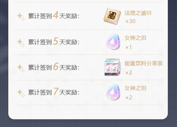 活动期间 每日登录游戏累计可得【女神之泪】5、【未名币】、【能量饮料分享装】等多样奖励