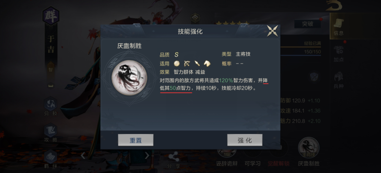 得益于自身高魅力值,于吉可以选择携带S级武技雄姿英发。常规智力输出武技计略百出,也是一个很好的选择。S级武技士别三日带来的神算加成,也可以提高于吉的输出能力。