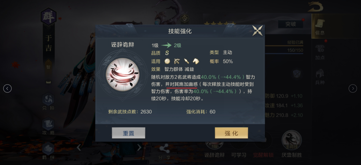 于吉的自带武技诬辞诡辩为主动技能,发动概率50%,随机对敌方2名武将造成智力伤害,并对其施加蛊惑,持续20秒。被蛊惑的目标每次释放主动技能,将受到智力伤害。对于缺乏解控并以主动技为主的队伍来说,诬辞诡辩可以让对方非常难受。