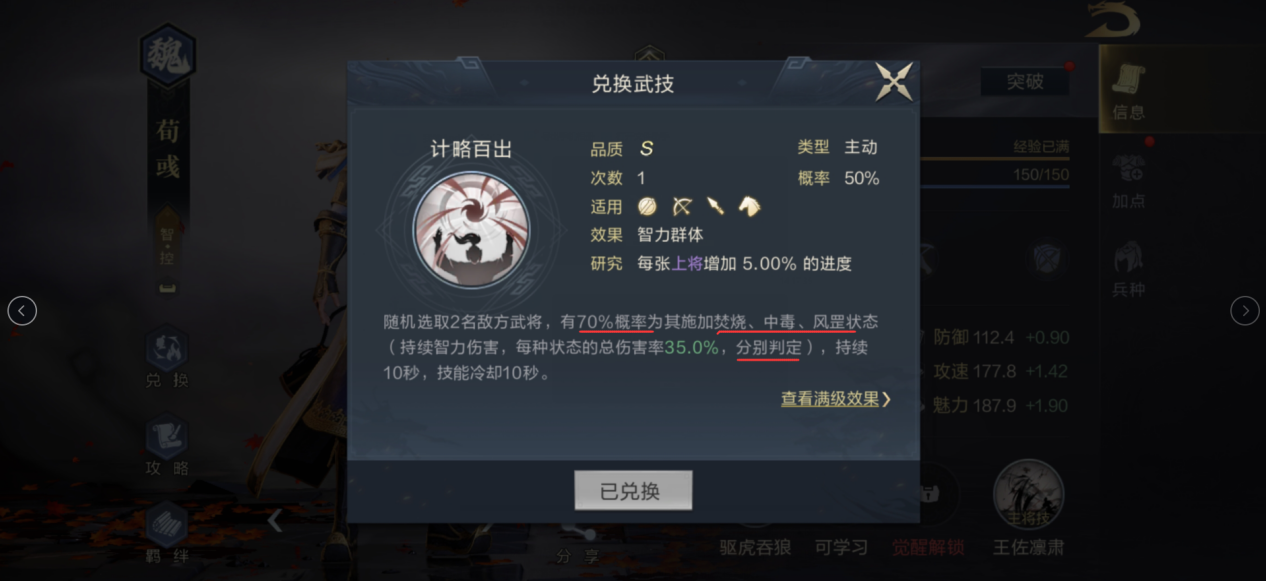 分解于吉后,会获得主动技计略百出。效果则是随机选取2名敌方武将,有70%的概率为其增加焚烧、中毒、风罡负面状态,并造成智力伤害。计略百出在智力队中算是万金油技能。具有负面状态伤害加成的武将,都可以装备。触发自己的技能特效,增强输出。