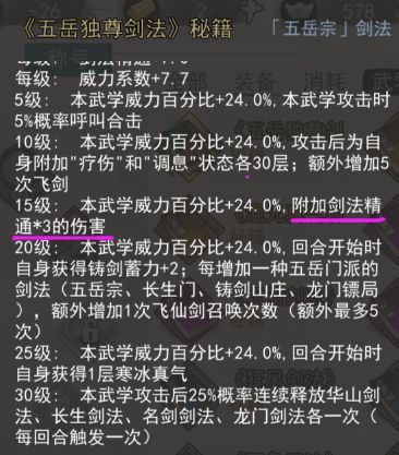例:附加精通伤害的武功、装备和天赋(下图)