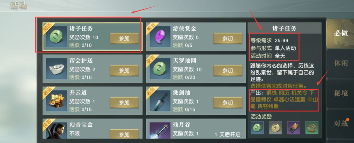 这里重点提醒一下各位少侠,在接取诸子任务时,尽量接取与您本命侠客相对应的诸子任务,比如您的本命侠客是卫庄,那么在接取该任务的同时也需要选择卫庄,因为该玩法的游戏奖励与命轨里的侠客成长路线息息相关。