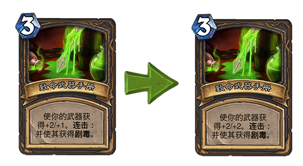 旧:使你的武器获得+2/+1。连击:并使其获得剧毒。 新:使你的武器获得+2/+2。连击:并使其获得剧毒。