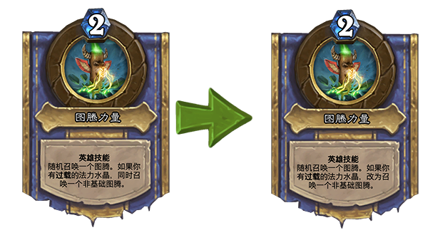 随机召唤一个图腾。如果你有过载的法力水晶,同时召唤一个非基础图腾。 新:随机召唤一个图腾。如果你有过载的法力水晶,改为召唤一个非基础图腾。