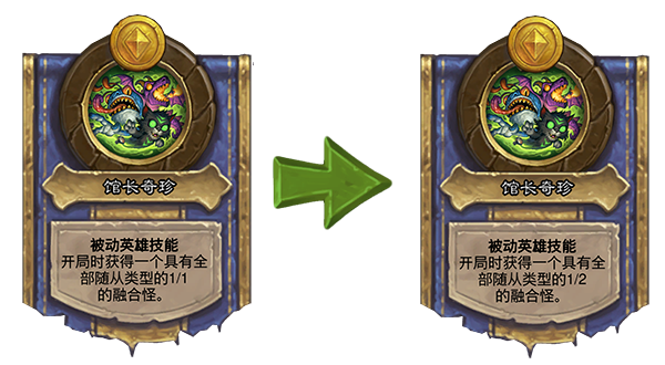 旧:开局时获得一个具有全部随从类型的1/1的融合怪。 新:开局时获得一个具有全部随从类型的1/2的融合怪。