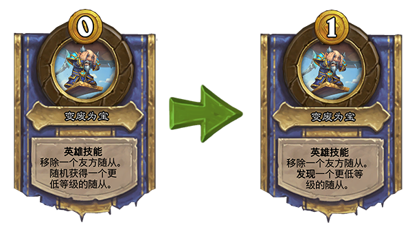 旧:[消耗0枚铸币]移除一个友方随从。随机获得一个更低等级的随从。 新:[消耗1枚铸币]移除一个友方随从。随机发现一个更低等级的随从。