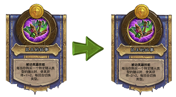 旧:每当你购买一个特定随从类型的随从时,使其获得+1/+2。每回合切换类型。 新:每当你购买一个特定随从类型的随从时,使其获得+2/+2。每回合切换类型。