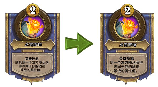 旧:随机使一个友方随从获得等同于你的酒馆等级的属性值。 新:使一个友方随从获得等同于你的酒馆等级的属性值。