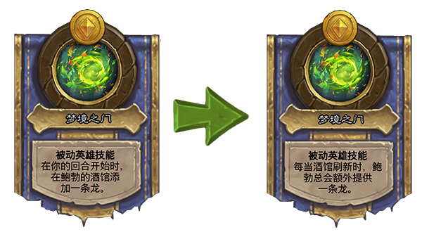 旧:在你的回合开始时,在鲍勃的酒馆添加一条龙。 新:每当酒馆刷新时,鲍勃总会额外提供一条龙。