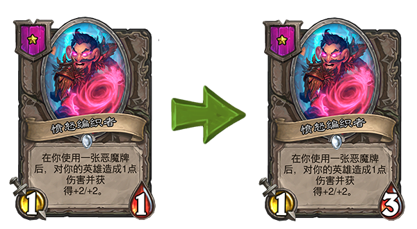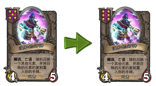 旧:3点攻击力,4点生命值。 新:4点攻击力,5点生命值。