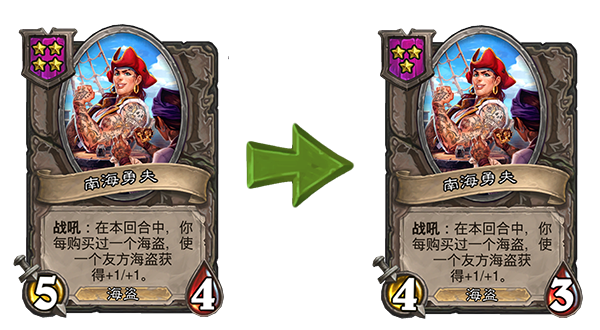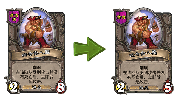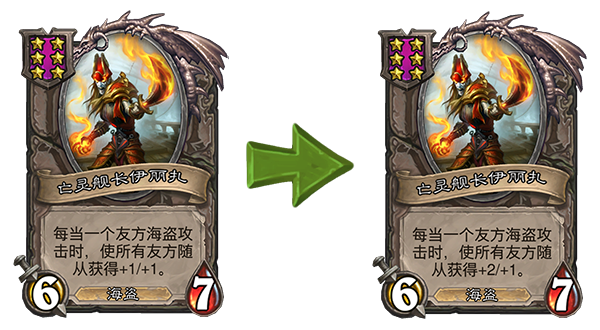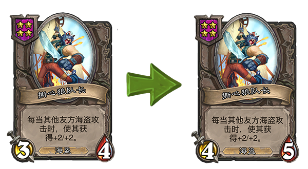 旧:每当一个友方海盗攻击时,使所有友方随从获得+1/+1。 新:每当一个友方海盗攻击时,使所有友方随从获得+2/+1。