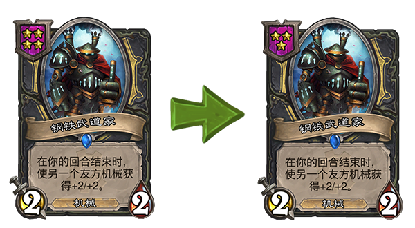 旧:在你的回合结束时,随机使每个随从类型的各一个友方随从获得+2/+1。 新:在你的回合结束时,随机使每个随从类型的各一个友方随从获得+2/+2。