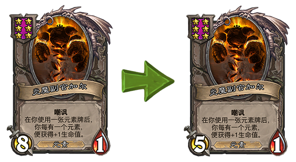 旧:[等级3]2点攻击力,8点生命值。 新:[等级2]2点攻击力,5点生命值。