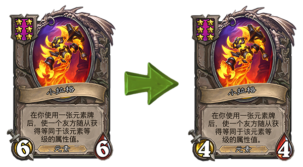 旧:[等级4]5点攻击力,4点生命值。 新:[等级3]4点攻击力,3点生命值。