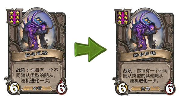 旧:战吼:你每有一个不同随从类型的随从,随机进化一次。 新:战吼:你每有一个不同随从类型的其他随从,随机进化一次。