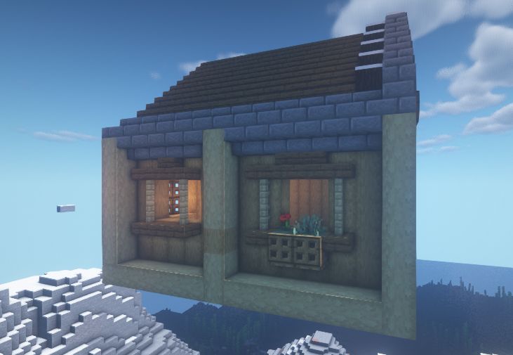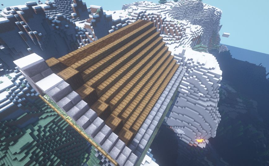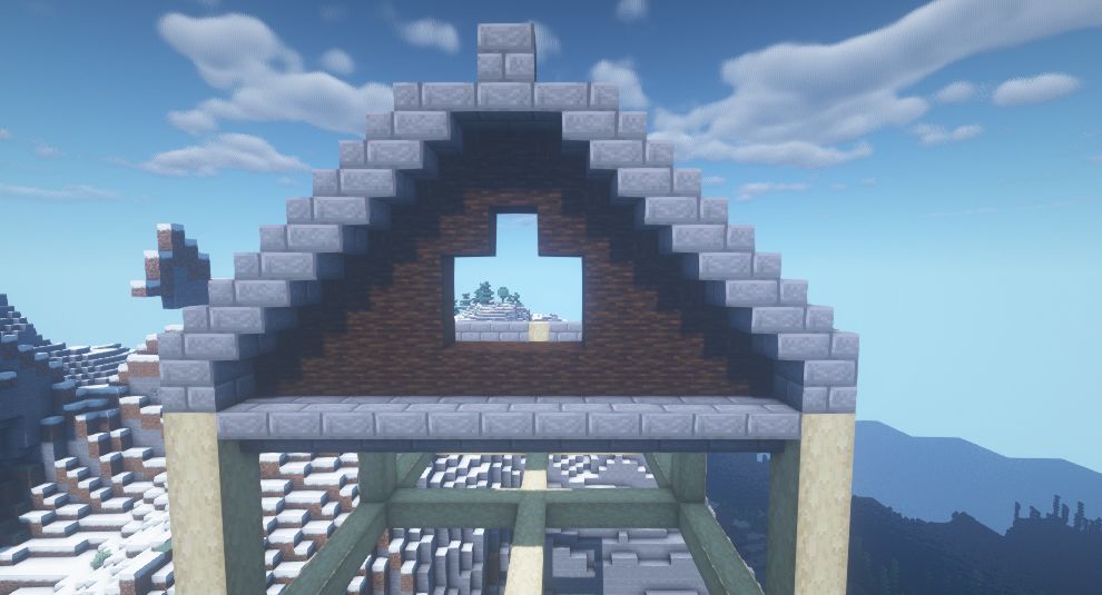 用石砖块,石砖楼梯和云杉木原木做出房子正门的屋顶部分。