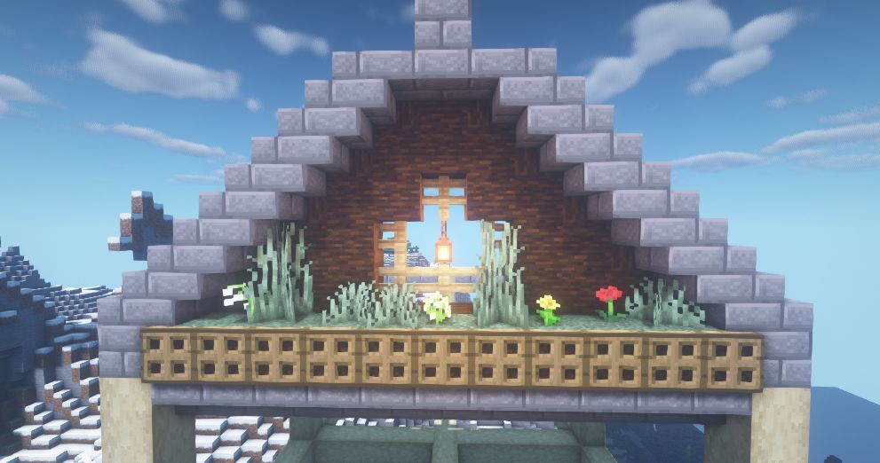 窗子的设计使用了云杉木楼梯,云杉木台阶以及白桦木栅栏如图搭建,还用了草方块做了一些点缀。