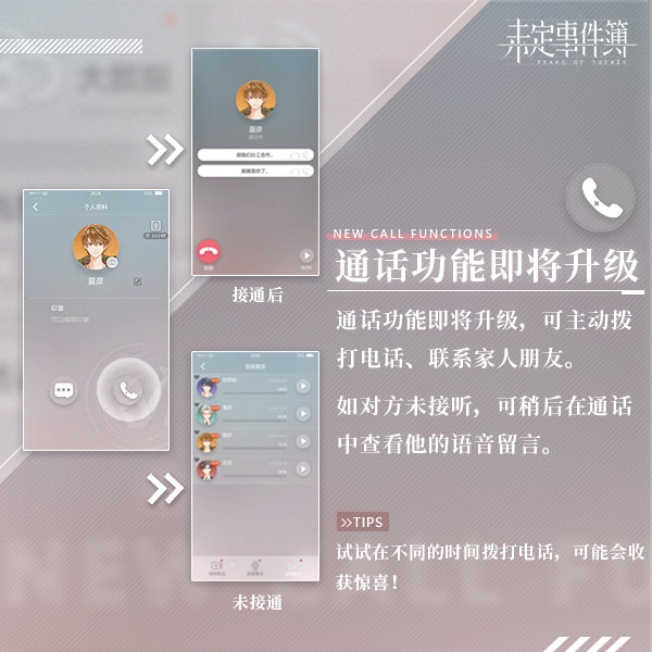 11月19日起,主动拨打电话功能上线,购买道具即可解锁。届时可享受限时折扣价28元,获得:未名晶片280,工作行程表1。1张工作行程表可解锁任一角色永久拨打电话功能