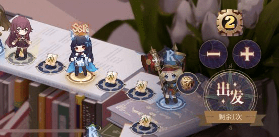 每次进入需要消耗一个粉色钥匙,之后便会开始玩摇骰子跳格子的小游戏。在格子里会有随机的R、SR或者SSR卡的Q版立绘。若玩家摇骰子以后,刚好行走到Q版立绘的格子上停下,就会获得这个角色的书页。玩家总共可以摇十次骰子,每次都可以选择摇单个骰子还是双骰子。