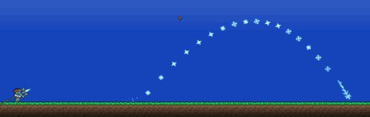 发出一个会飞行的矛,滑过的轨道留下雪花,几秒钟后下落,有效的造成如下雨似的地毯式打击,在撞到物块或怪物后消失;