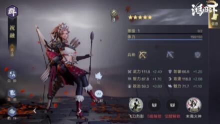祝融在游戏中的定位为输出,作为五星武将的她,满级后在武力值和攻速值上已经超过了连击流常用的徐晃、张辽,比起吕布等以武力为代表的角色也不逞多让,是当之无愧的女武神。智力方面更是超过了大批武力优秀的武将,堪称有勇有谋。