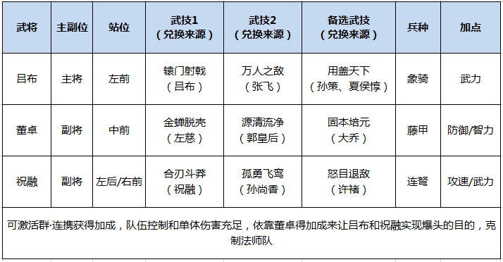 目前比较流行的纯武流玩法,都是依靠技能AOE效果或高额的随机单体伤害来进行输出,但祝融的特点就是依靠普攻进行输出,虽然在群体伤害上略有不足,但普攻会比技能更加稳定释放,配合吕布的辕门射戟来爆头敌方主将是不错的思路。