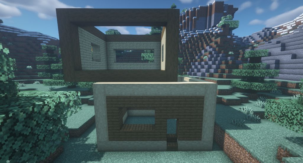 接着用白桦木板和云杉木板分别搭建墙面,正面二楼留空。