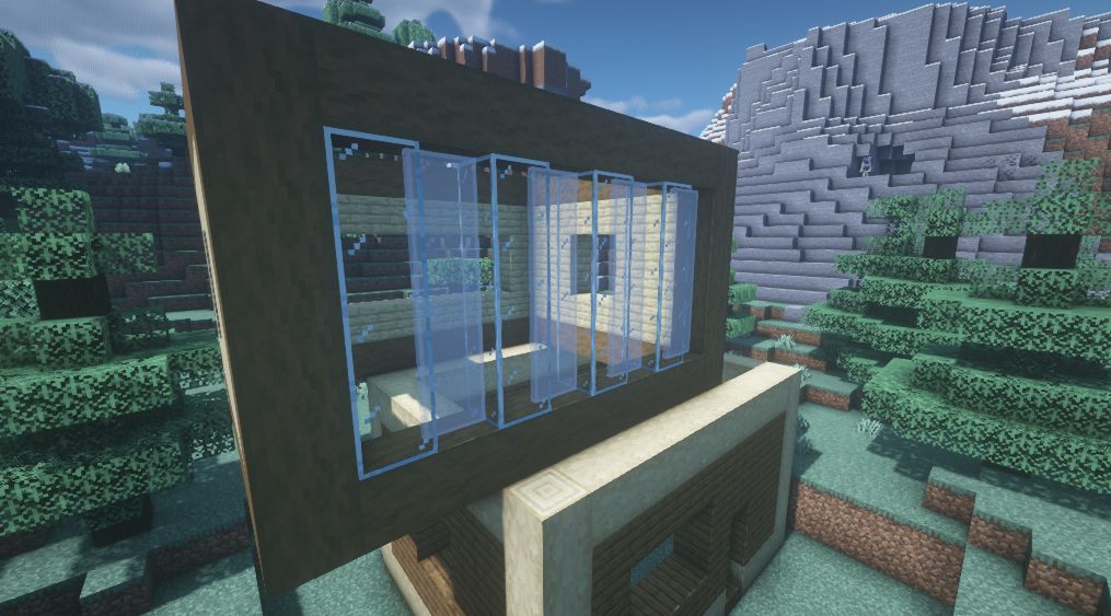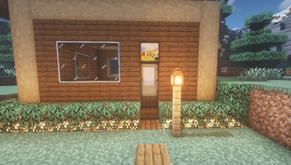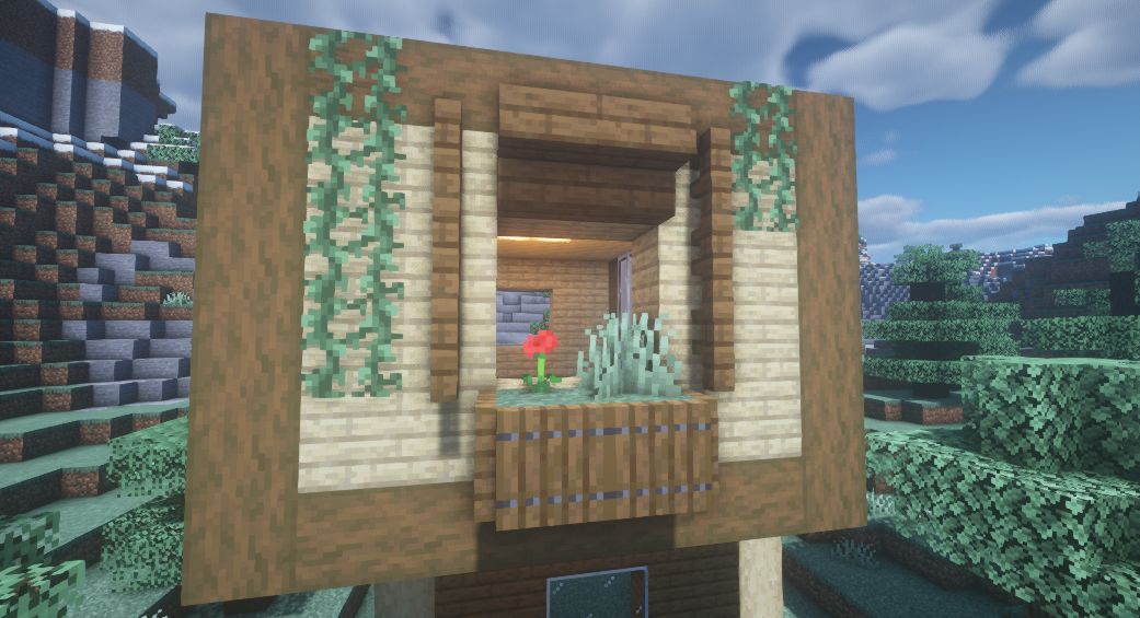 其他的窗户用云杉木栅栏,云杉木活板门,草方块和藤蔓进行了如图的装饰。