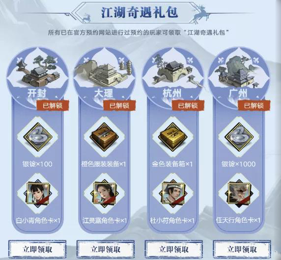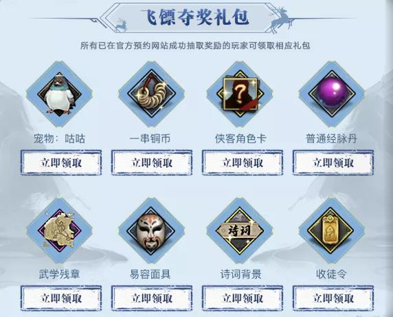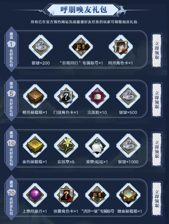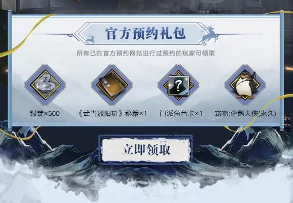根据预约任务的完成度,各位参加过预约的大侠可以在此领取到4种不同的奖励礼包,分别是:包含银锭、《武当烈阳功》秘籍、门派角色卡和宠物企鹅大侠奖励的官方预约礼包: