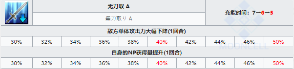 三技能效果为降低敌方单体30%~50%攻击力1回合,提升自身30%~50%NP获得量1回合,充能时间7~5回合。职阶技能【对魔力】自身弱化耐性提升15%,【骑乘】自身绿卡性能提升8%。