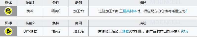(精英0)执着:进驻加工站加工精英材料时,相应配方的心情消耗恒定为2;