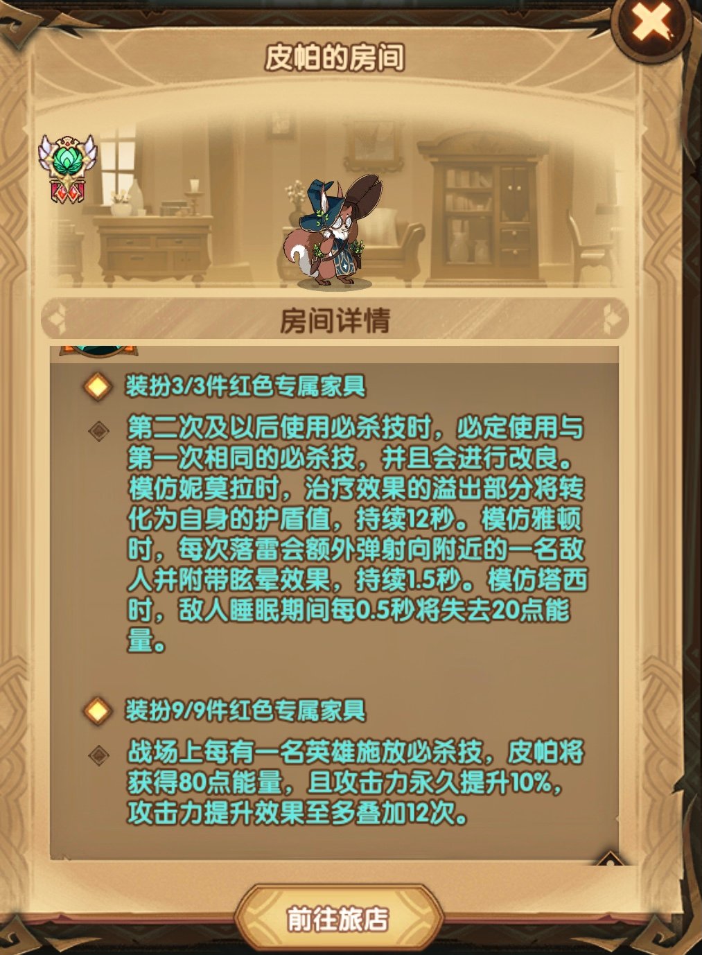 3红的皮帕,蝴蝶大招能让敌人失去能量,满大控制时间就是失去160点能量。损失的能量不多,但拥有恐魔禁魔的效果下,已经足够。9红家具能直接让皮帕成为输出核心,每次友军放大提升自己的能量,完美契合能量的宗旨,每次还能提升皮帕的攻击,让皮帕能担任输出核心的位置。