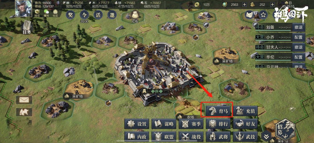 名望18级后主公就可解锁育马系统(箭头所示图标),在开启育马系统后会获得一匹赠送的白马,马匹在游戏中分为牡:公马、牝:母马,只有异性才可育种,通过育种就有概率获得更高一级的马匹,育马需要消耗粮草、铜币和时间。