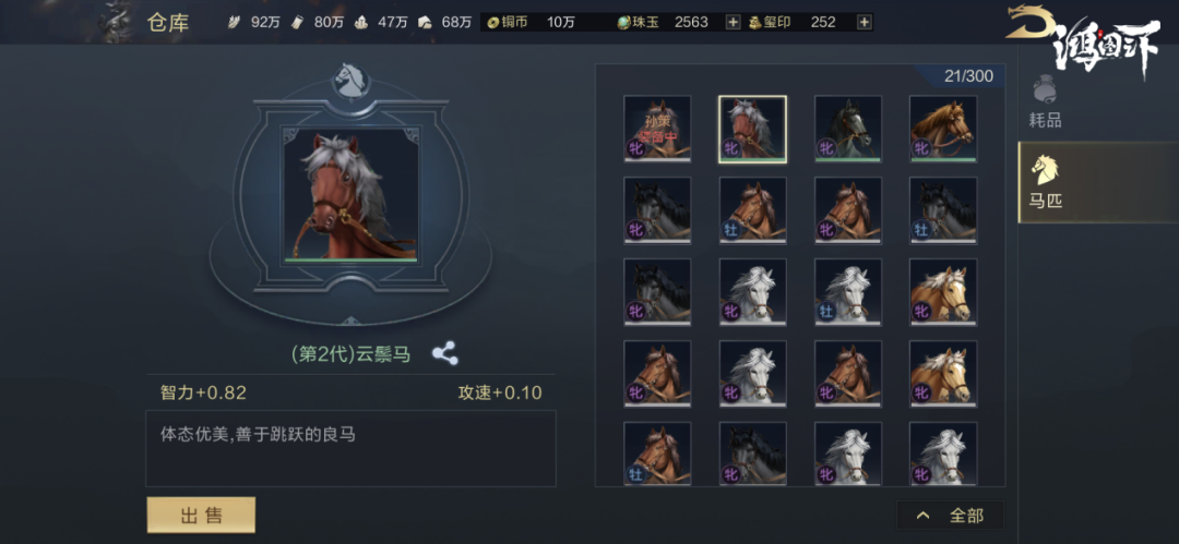在内政-仓库-马匹项中可以查看自己拥有的全部马匹,通过点击即可查看马匹所能提供的加成。