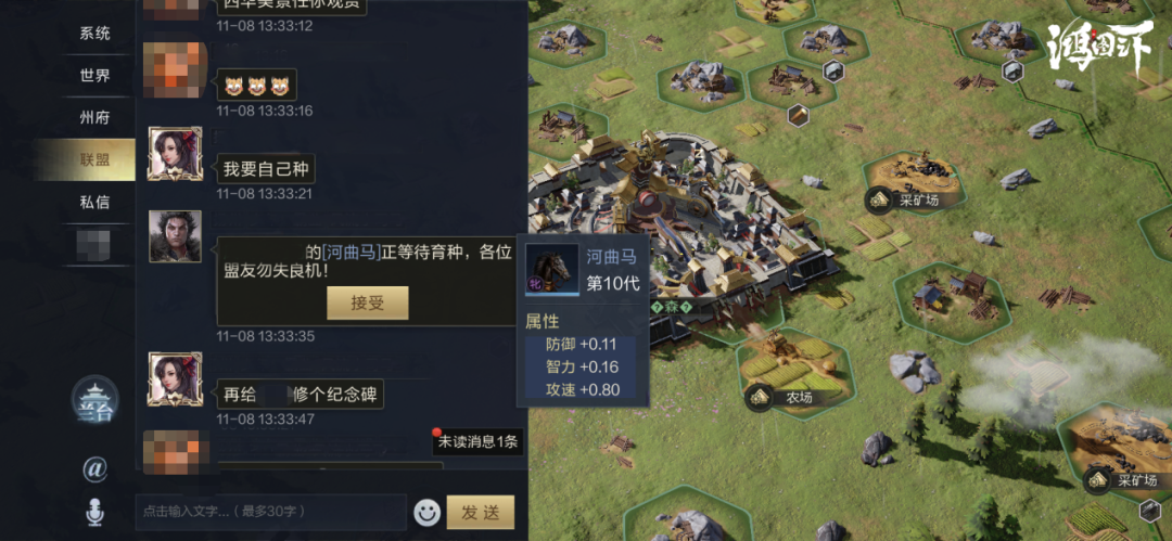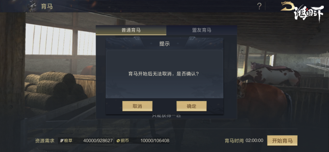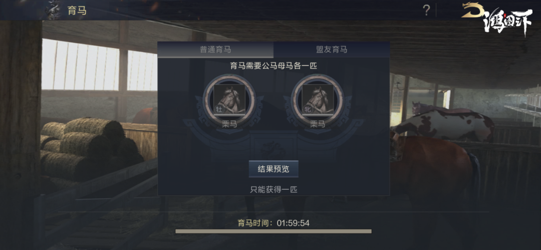 盟友育马:主公和盟友各出一匹马(只要满足1牡1牝即可)进行培育。这种方法在盟友有高代马时可以更好的提升产出马匹质量,也能降低冷却中的马匹数量,因此更推荐盟友育马。
