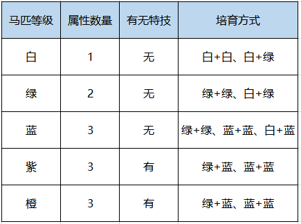 首先要知道一点,一匹马不会拥有两个同属性,每种属性只存在一个,所以在培育的时候要注意属性重复数量,如果用A+A得到的只会是A,A+AB最多也只得到AB,因为属性的数值是随机的,这种方式只适用于前期培育大批低代2属性马,可有效降低培育时间。