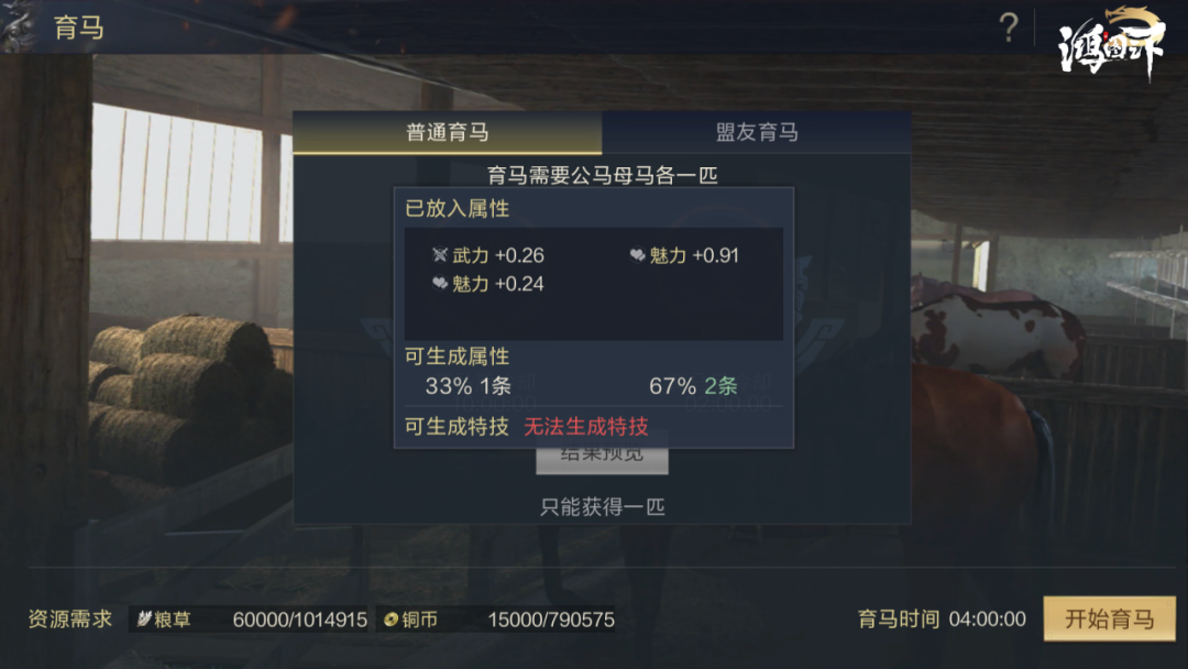 普通育马:主公自己提供牡、牝马进行培育,每次产出一匹。