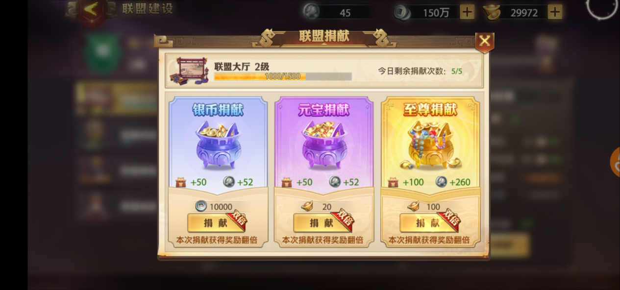 联盟捐献后可获得联盟币,以此提高我们的联盟科技,进而强化战力,每日5次的联盟捐献次数建议皆使用元宝或银两进行捐献。当元宝数量多时,建议使用至尊捐献进行联盟捐献,以在单日获得更多的联盟币。