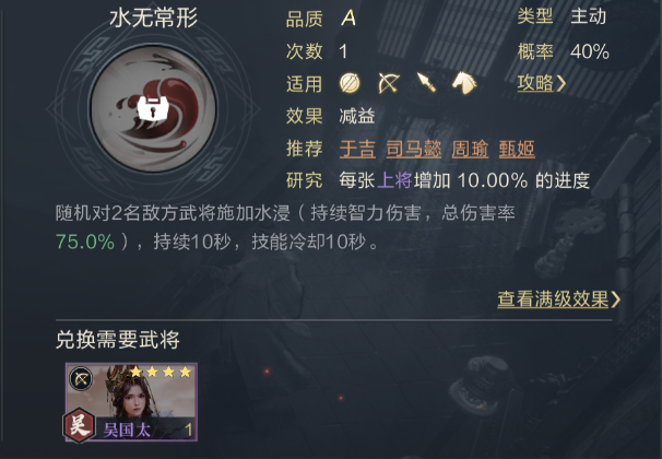 以郭皇后自身建立阵容,省下一个技能格子上源清流净,遇到法师队郭皇后可带釜底抽薪,遇到武力连击队可考虑带犯颜激辩,常规附加水浸+焚烧buff增加伤害。