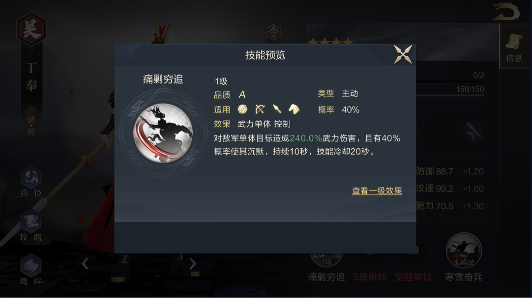 副将文鸯/丁奉也是一样,省下一个技能格子上将飞龙城或痛剿穷追,再搭配半济而击减智力!