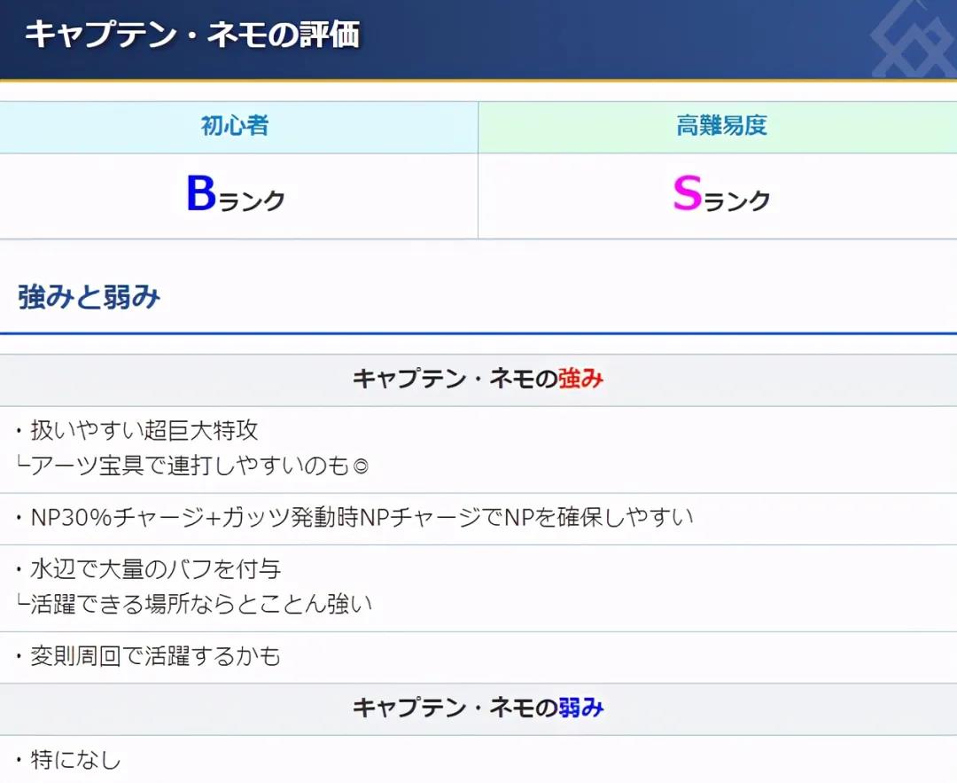 整体来说算是一个比较常规的骑阶单体从者,没有太多花里胡哨的效果,但是也确实使用,宝具卡是目前最强势的蓝卡宝具,高难单体场合有连发宝具的可能性,而重点是尼莫在90+周回本的发挥应该是非常出色的,带有自充效果,多种群体增伤buff,非常适合双核体系,配合陈宫宝具触发毅力效果能够把二技能的80%充能直接拉满,真的是很适合陈宫体系了。