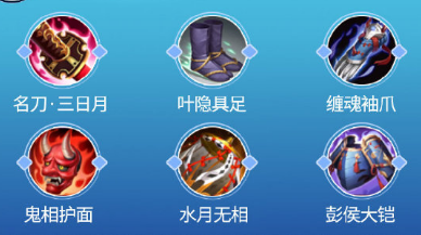 名刀三日月可以提供移速与攻击加成,叶隐具足提供护甲,方便对线物理伤害式神。缠魂袖爪提供护甲、冷却与降低移速的效果,提供坦度同时增加一定的普攻附加伤害。鬼相护面增加攻击力与生命值,能在低血量提供护盾与提高伤害。水月无相可以增加双抗,并提高久次良一技能[鲸骨.开]的命中回血效果。最后补充一件彭侯大铠,为后期团战增加一些坦度,也能在切入开团后提供减疗与减速效果。