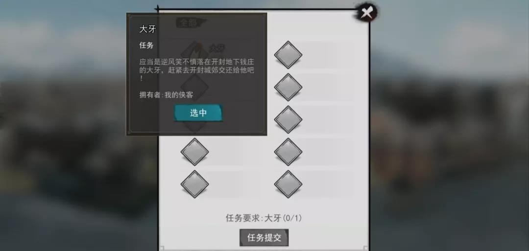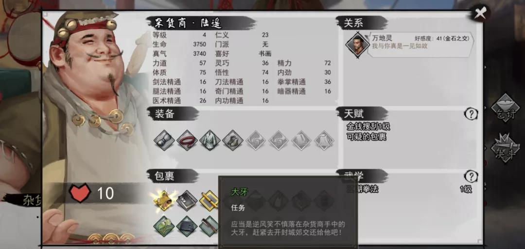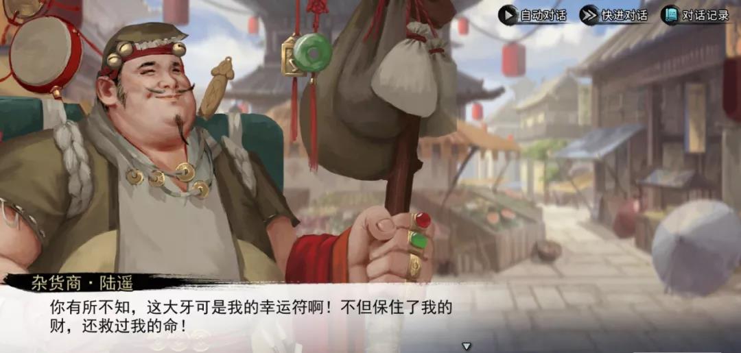 逆风笑细想过后,便回忆起不久之前,曾与开封闹市的杂货商陆遥大吵一架。大牙极具特色,很有可能被陆遥拿走收藏。大侠们寻找陆遥并进行观察,便会发现这颗大牙就在陆遥的身上。